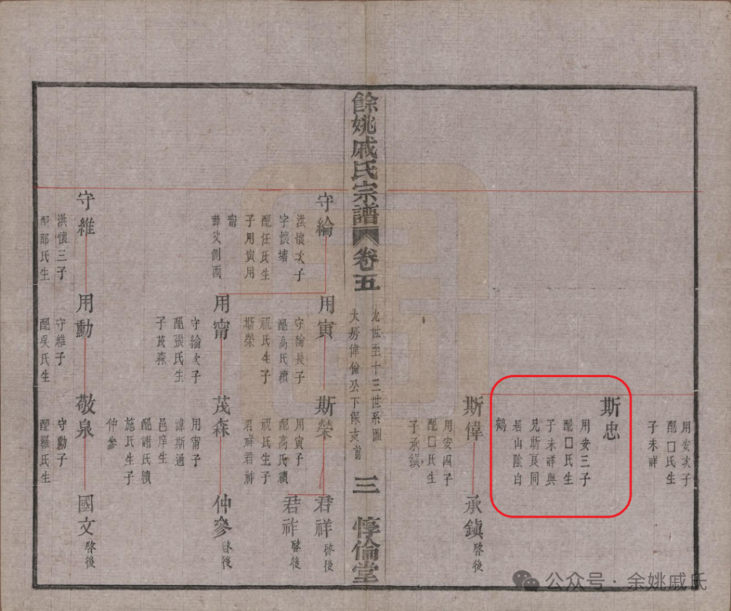 2. 戚斯忠是大房伟伦公下保支十二世,但是族谱未记载其后代情况。而且历代迁居山阴白鹤的余姚戚氏后代众多,白鹤戚氏不见得和戚斯忠同支,还需要仔细核查族谱。