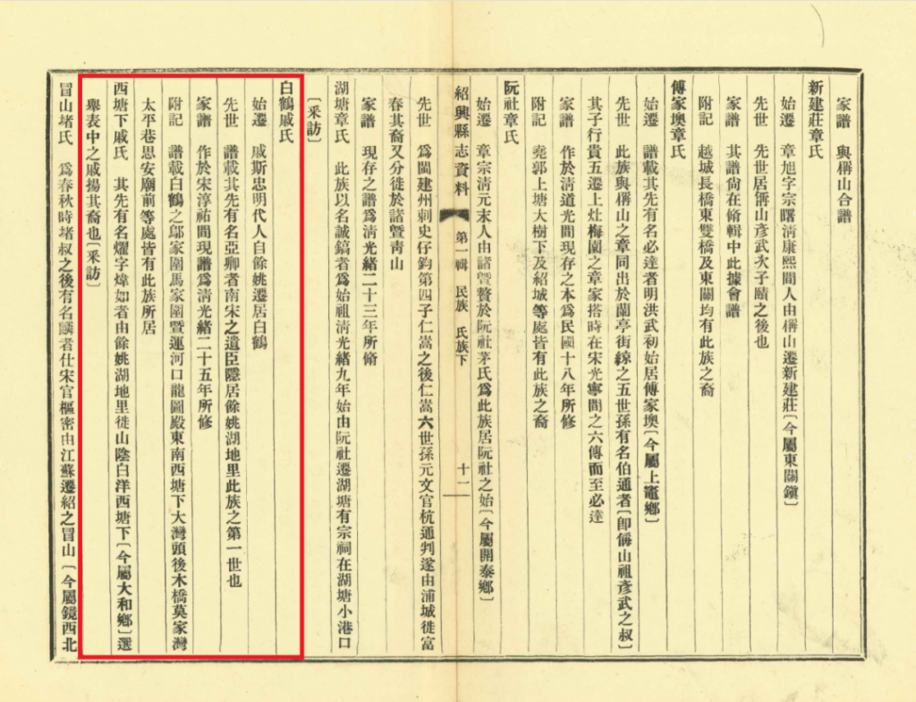 《紹興縣誌資料第一輯》(民国二十六年二月印)“氏族”中载有“白鹤戚氏”和“西塘下戚氏”。